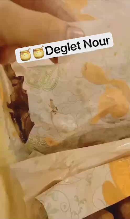 La Deglet Nour algérienne est mondialement reconnue pour sa qualité supérieure. Contrairement aux dattes charnues et opaques, elle se distingue par sa robe dorée, sa texture fondante et son noyau que l'on devine à travers sa chair sous la lumière du soleil. Chaque datte est une promesse de douceur et d'authenticité, héritage d'un savoir-faire ancestral et d'un terroir d'exception.